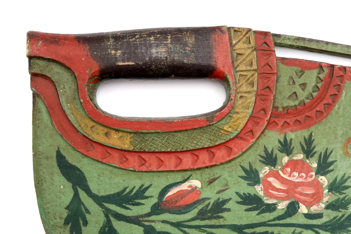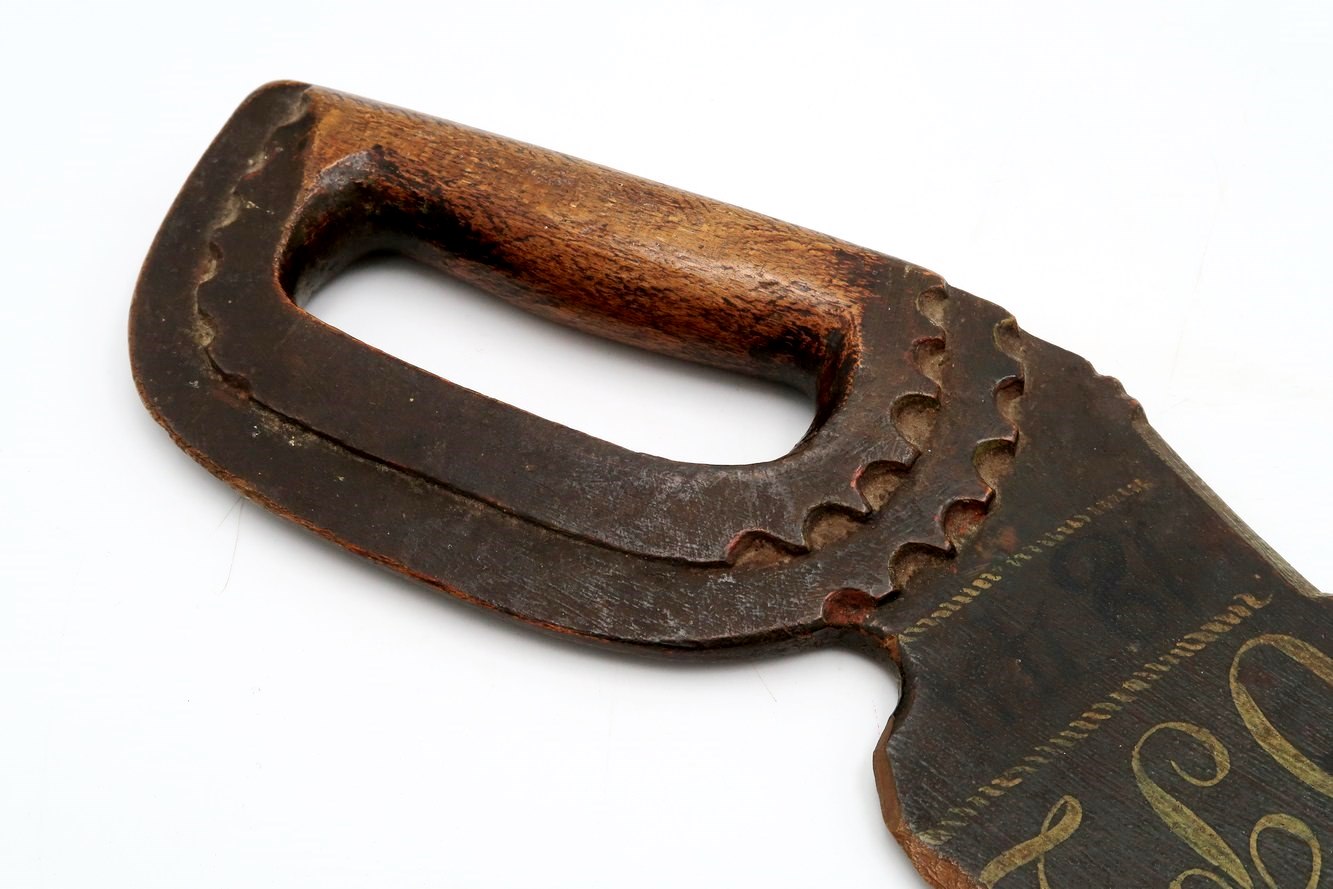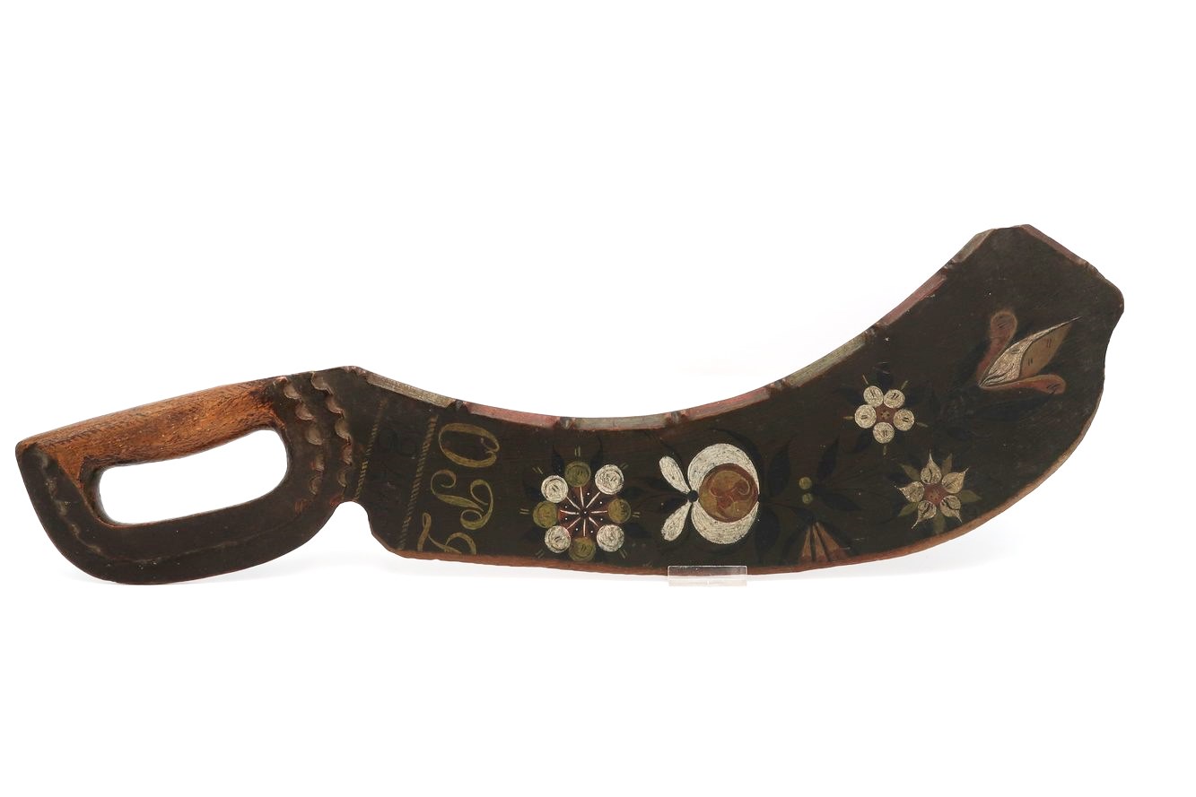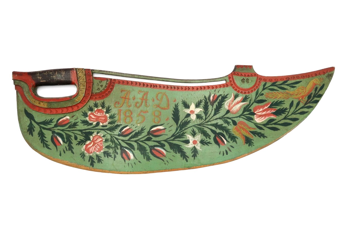 27. Sweden, 1844, 58 x 14 cm. Linen-softening knife ("scutching knife") of unusual form, showing a long patina of use. Decorated with various floral motifs. The paint is original. $90