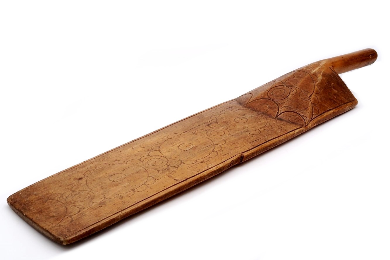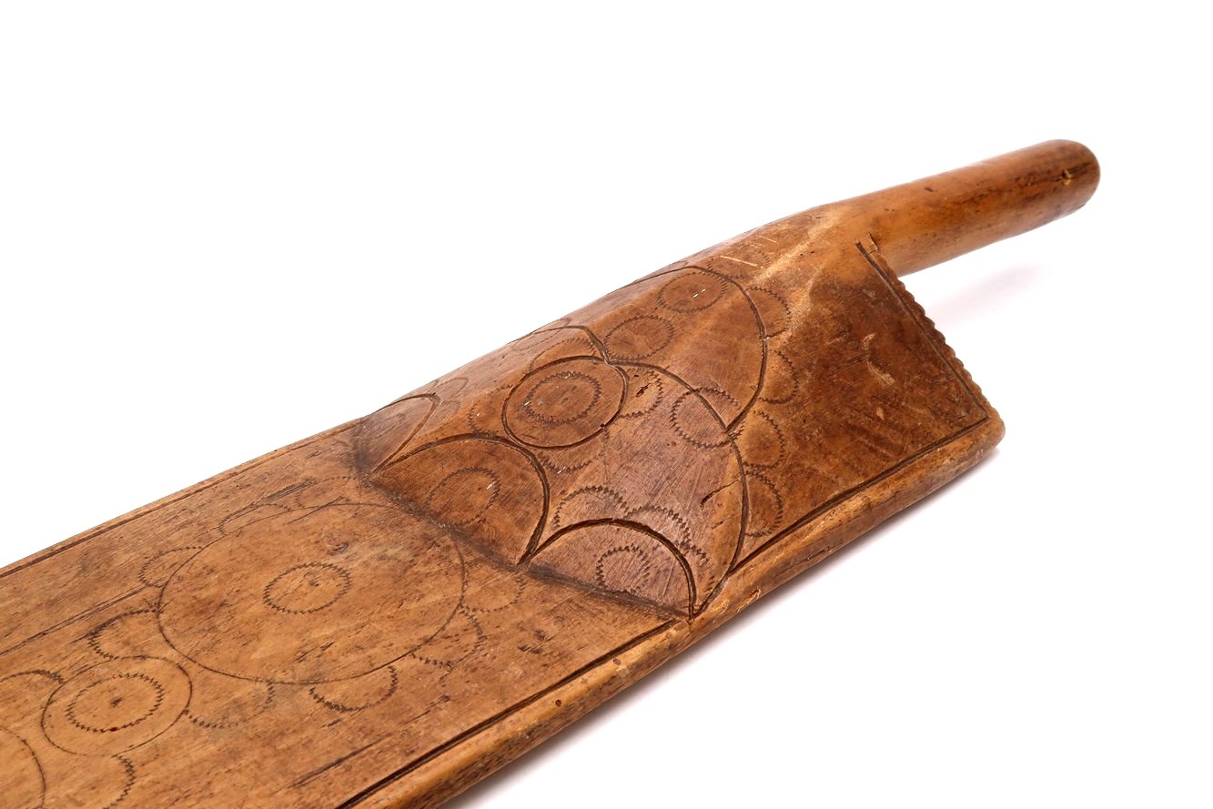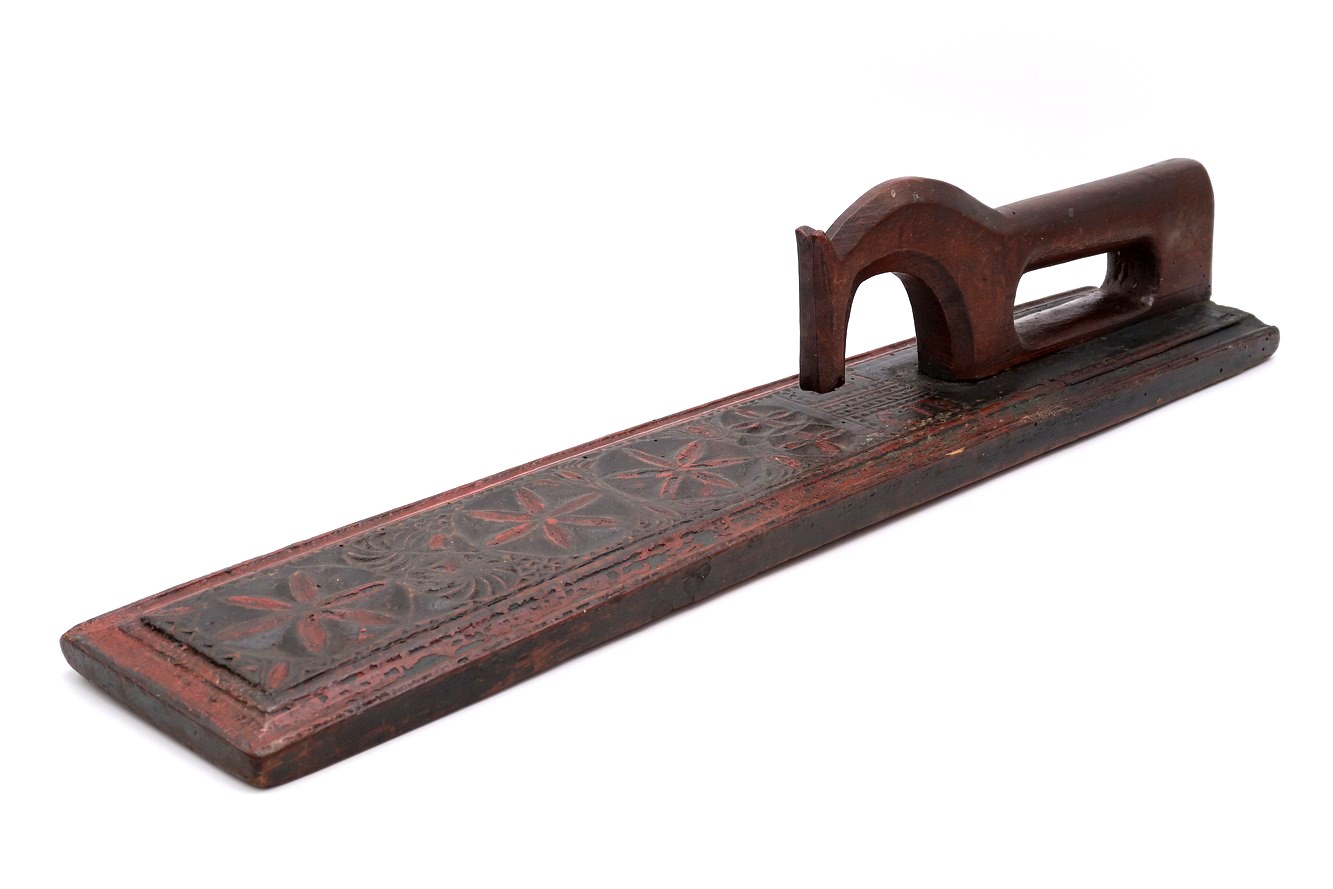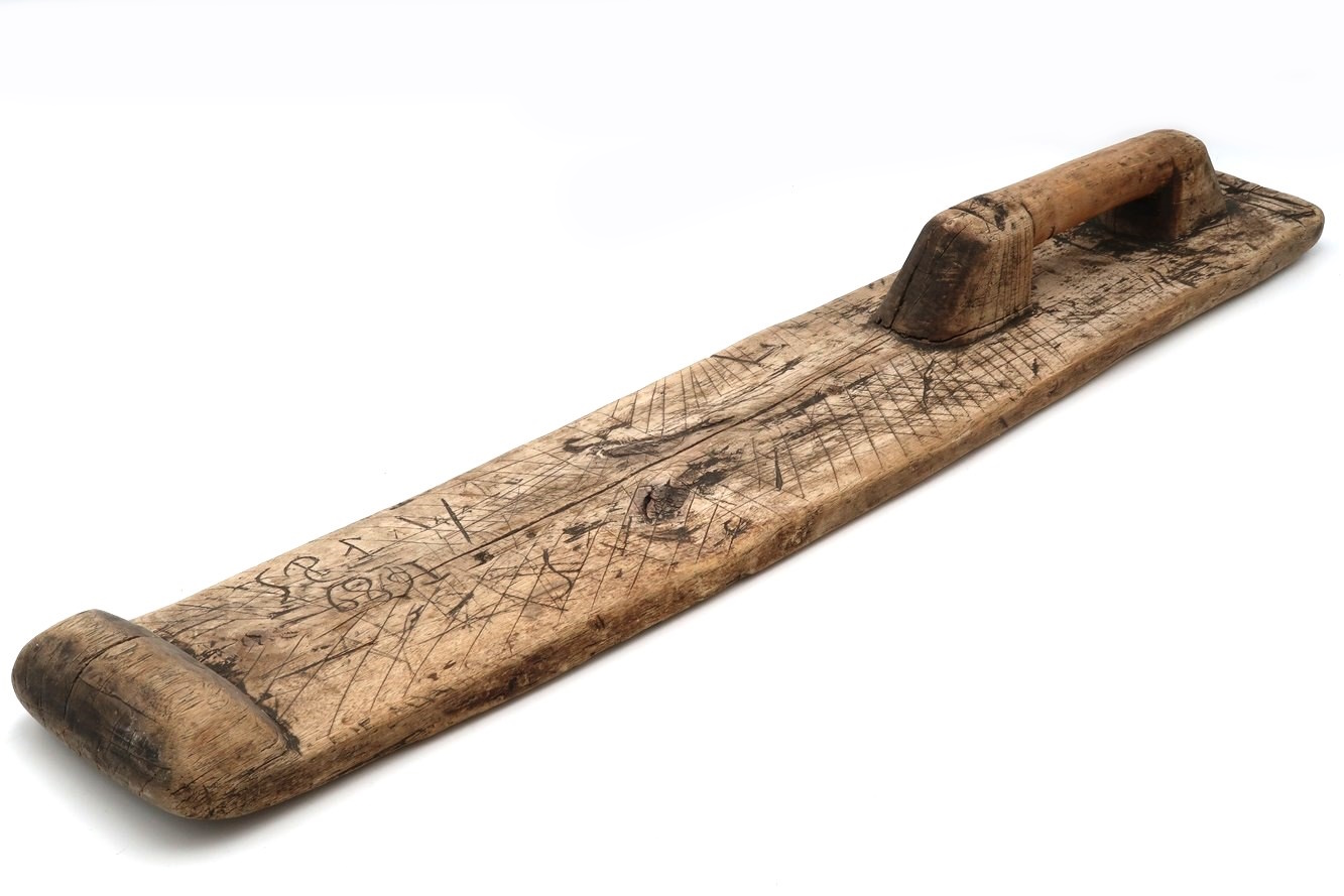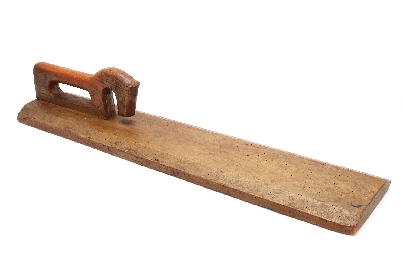 18. Germany, c. 1900, 70 x 8 cm. Both utilitarian and highly elegant mangle board, which would have been used to soften linen fibres on large fabrics such as bed sheets. The end opposite the handle has been in contact with water, perhaps for stirring laundry. Varnished. $50