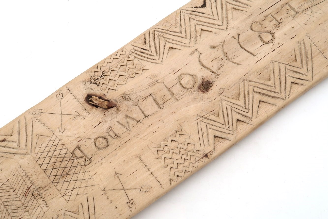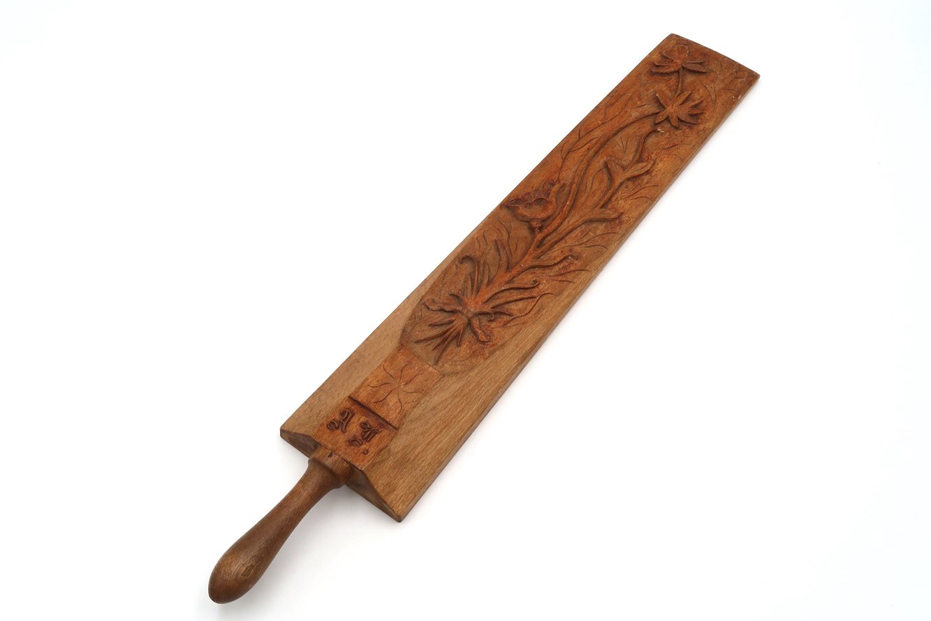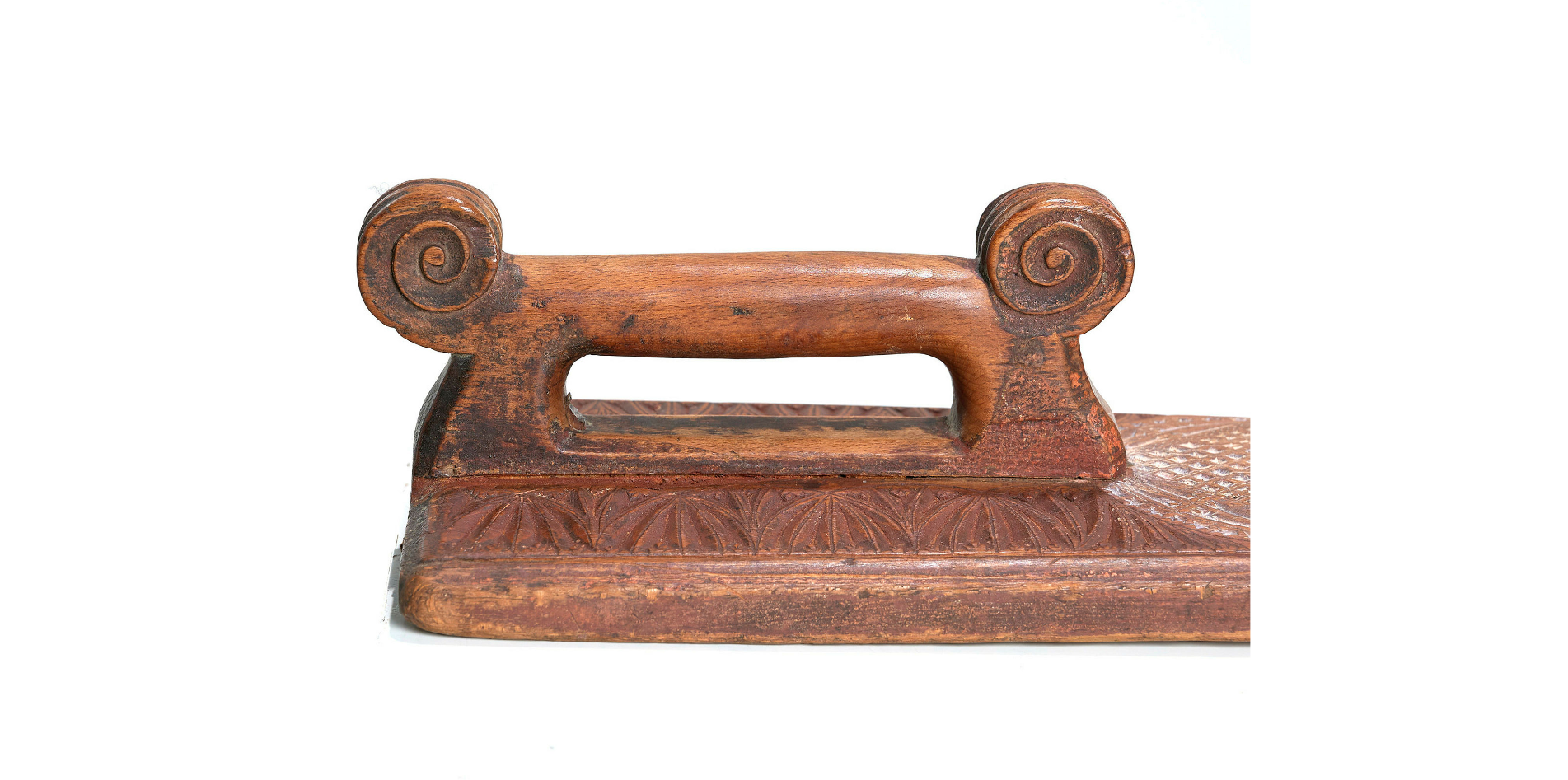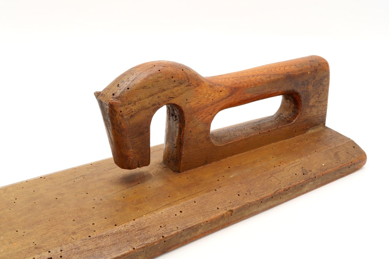 18. Germany, c. 1900, 70 x 8 cm. Both utilitarian and highly elegant mangle board, which would have been used to soften linen fibres on large fabrics such as bed sheets. The end opposite the handle has been in contact with water, perhaps for stirring laundry. Varnished. $50
