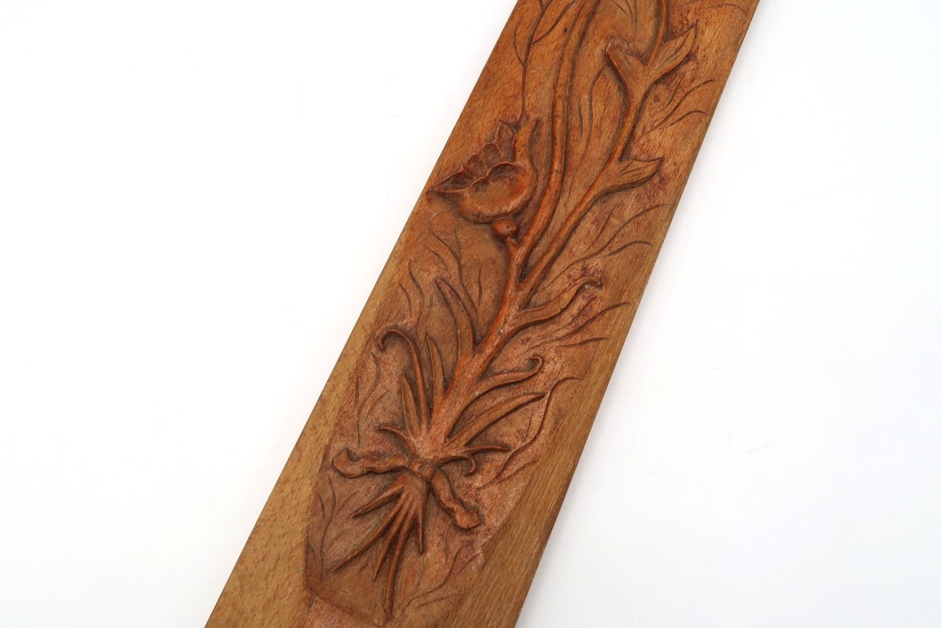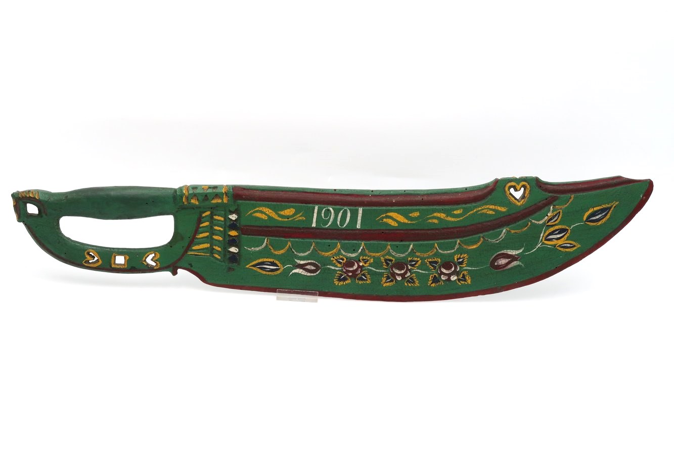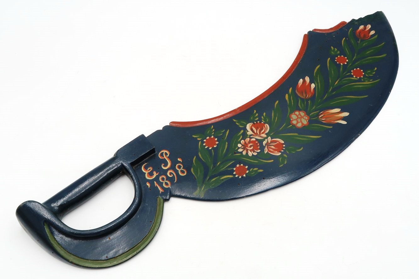 25. Sweden, 1898, 59 x 15 cm. Linen-softening knife ("scutching knife") decorated with various flowers. The tip of the knife has an old break. $75