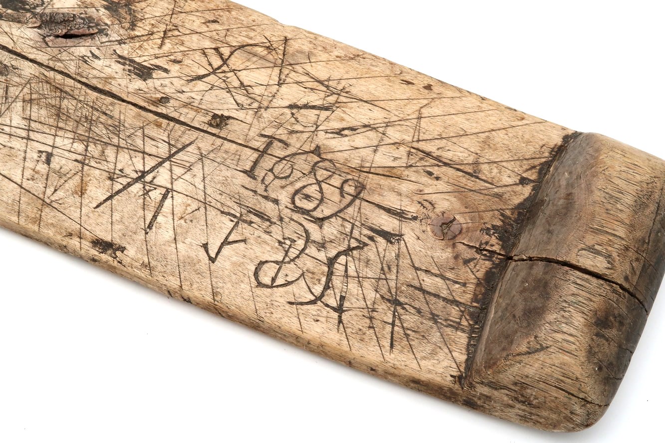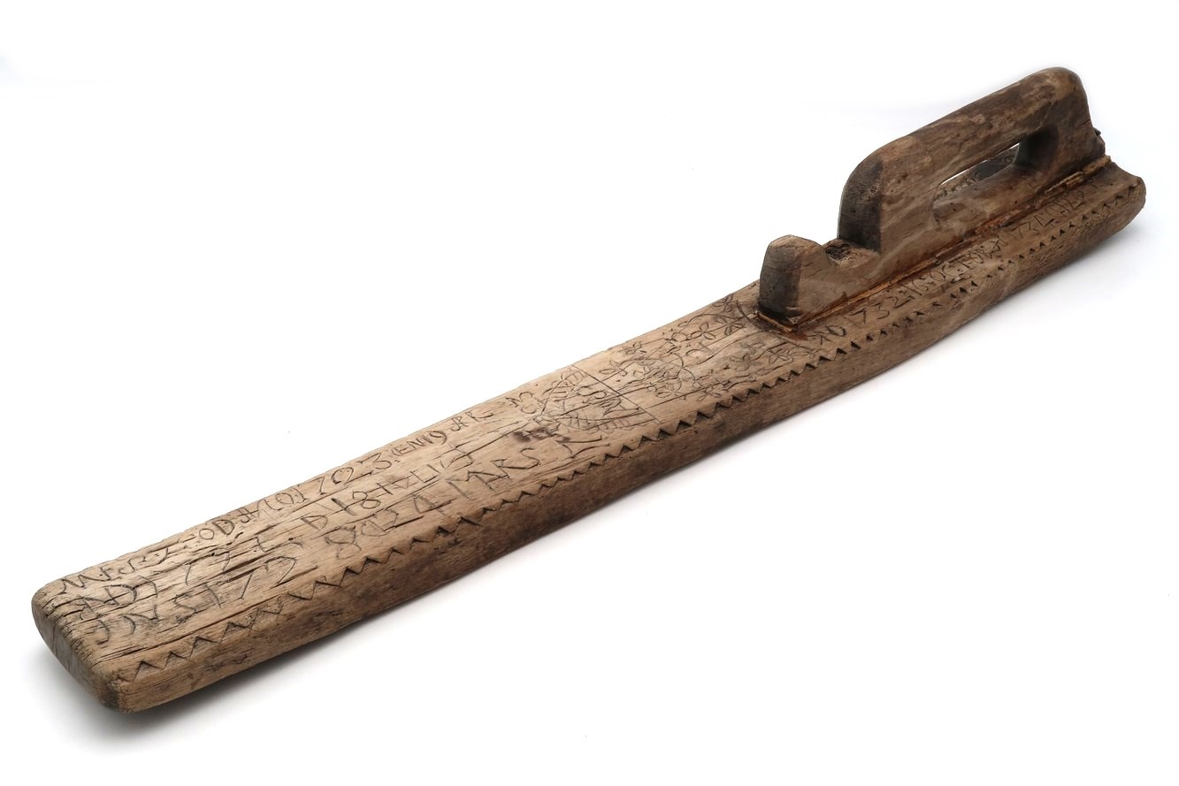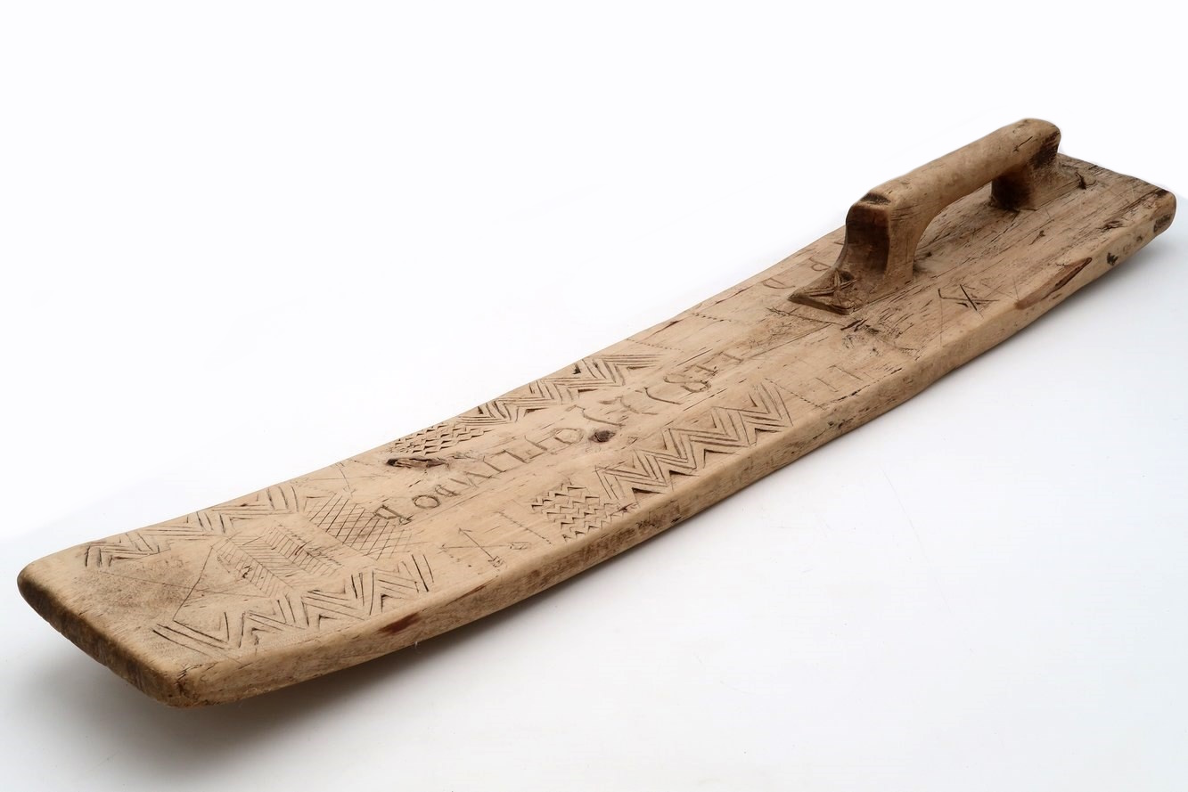 20. Norway, 1689, 73 x 13 cm. Mangle board of great antiquity, simple but very practical to use, as was always the case at the time. The handle is wide, fits well in the hand, and a second handle at the far end makes it easy to apply pressure to the laundry. Decorated with numerous symmetrical lines. $100