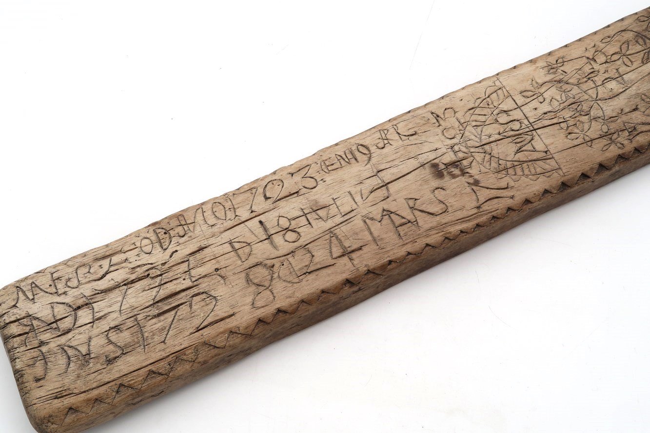 21. Norway, 1723, 66 x 8 cm. This mangle board is a magnificent family record, as it gives, in addition to the year of marriage (1723), the birth year (as well as the month and day) of each of the children: 1725, 1728, 1732, 1734, and 1736. The handle has been broken and poorly re-glued. $60