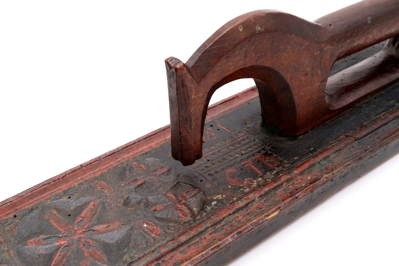 11. Norway, c. 1780, 73 x 13 cm. The board is covered with various geometric motifs, as well as a couple standing before a church with a horse. The man holds a long pipe and the woman a glass of alcohol. The handle has a few breaks and has been re-glued. $125