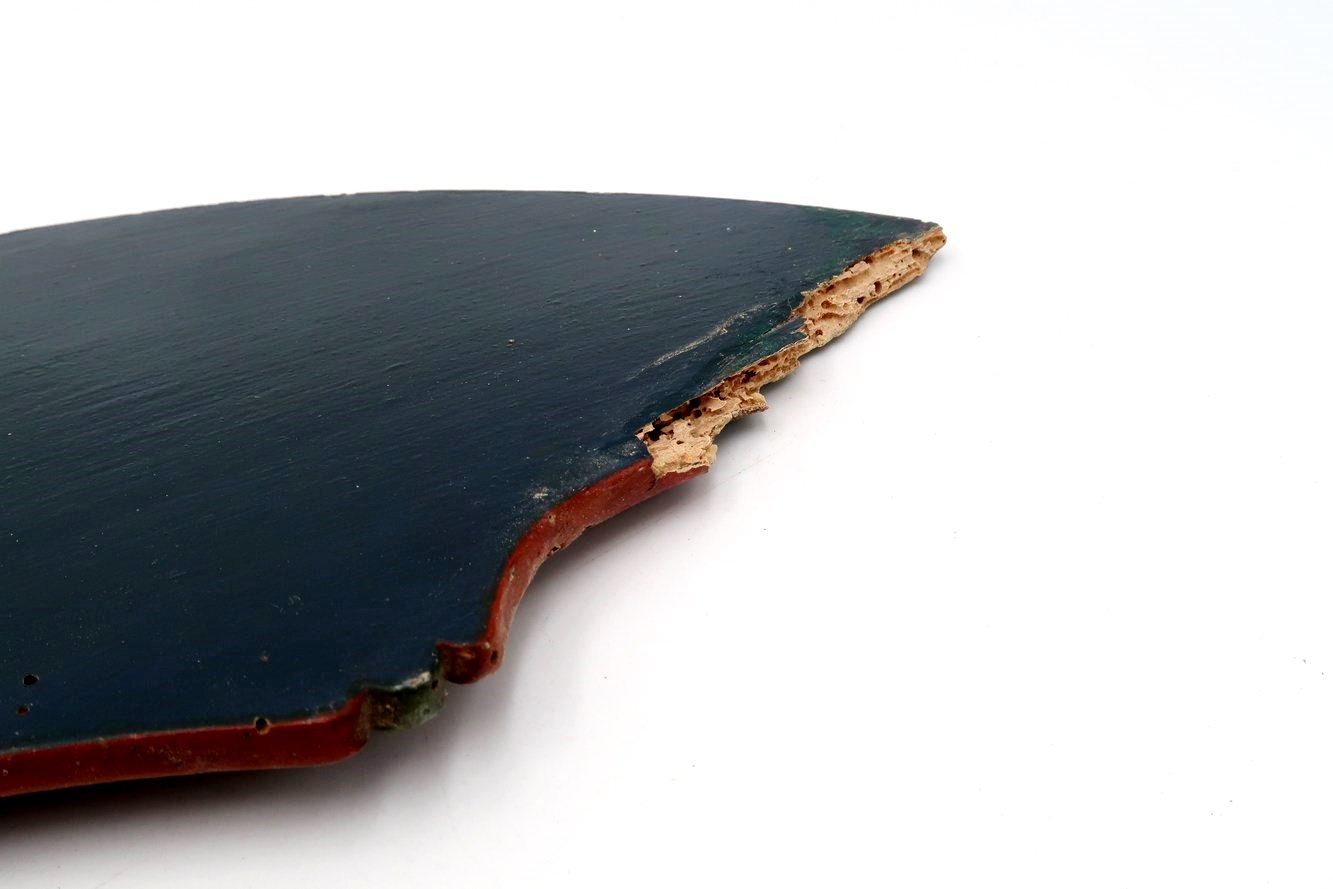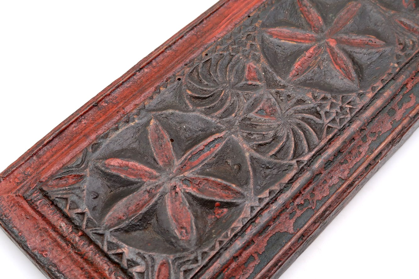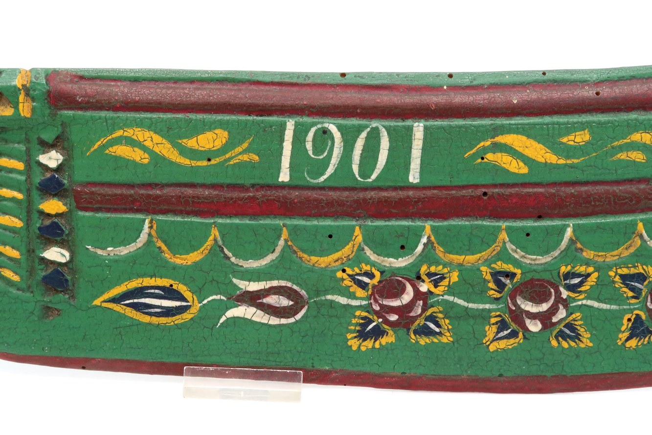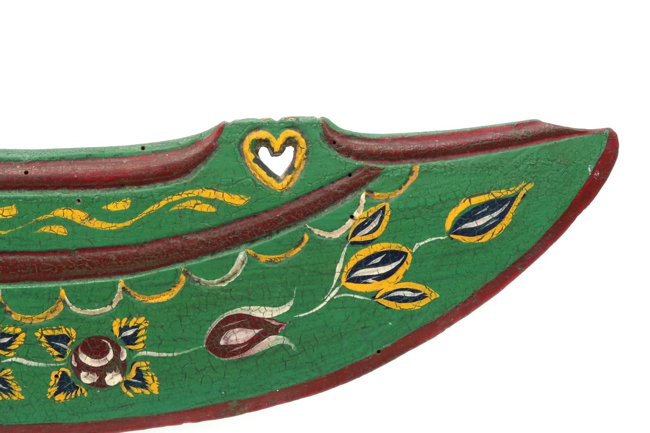 13. Norway, c. 1780, 70 x 11 cm. Long, slender board with six rosettes, each one different. The paint is original and bears witness to long use. Part of the rear legs was broken in the past and repaired with a wrought-iron nail. $300