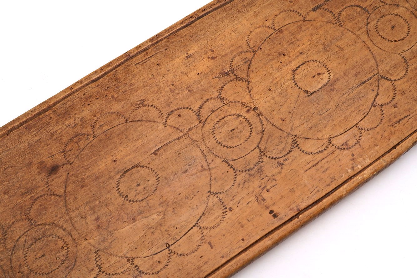 14. Denmark, dated 1766, 64 x 14 cm. Fine, highly graphic mangle board whose radiating motif draws the eye. It bears old traces of polychromy, partially worn away by intensive use. The board has been restored and reinforced with a wooden panel on the underside. $175