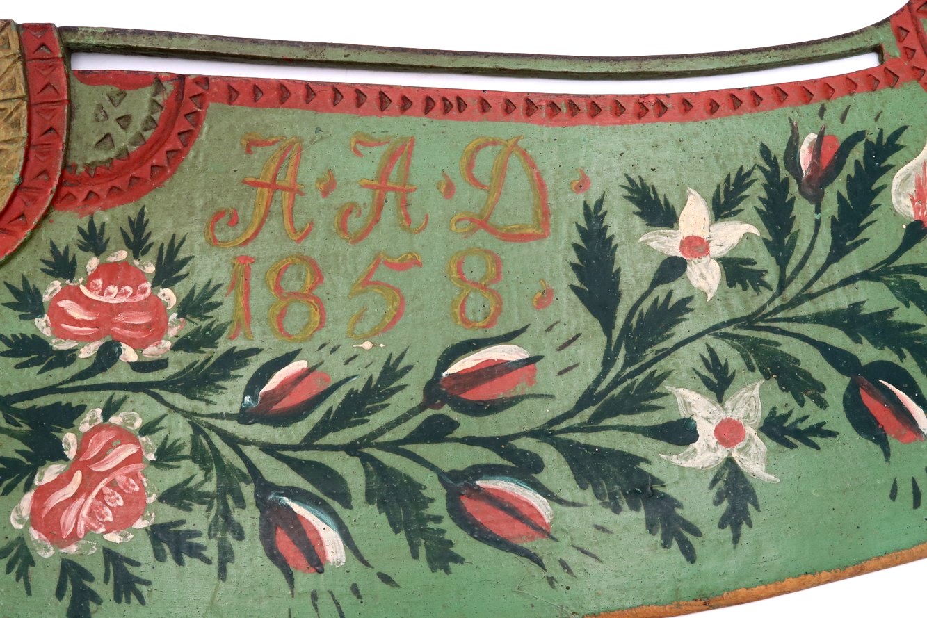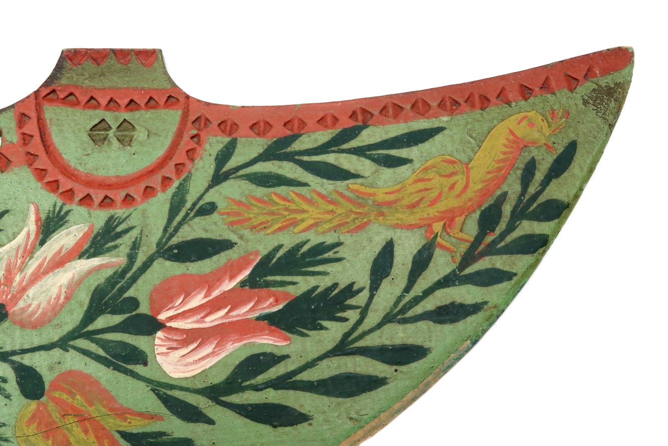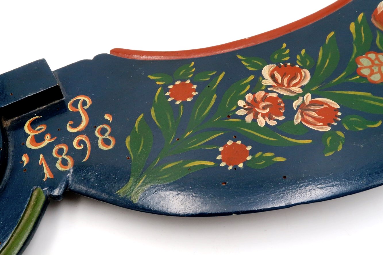 2. Sweden, c. 1850, 61 x 15 cm. Charming mangle board painted with a beautiful decoration of flower bouquets and bunches of fruit. The horse is refined but perfectly recognizable, in the Gustavian style. With its original paint and a patina of use. $425