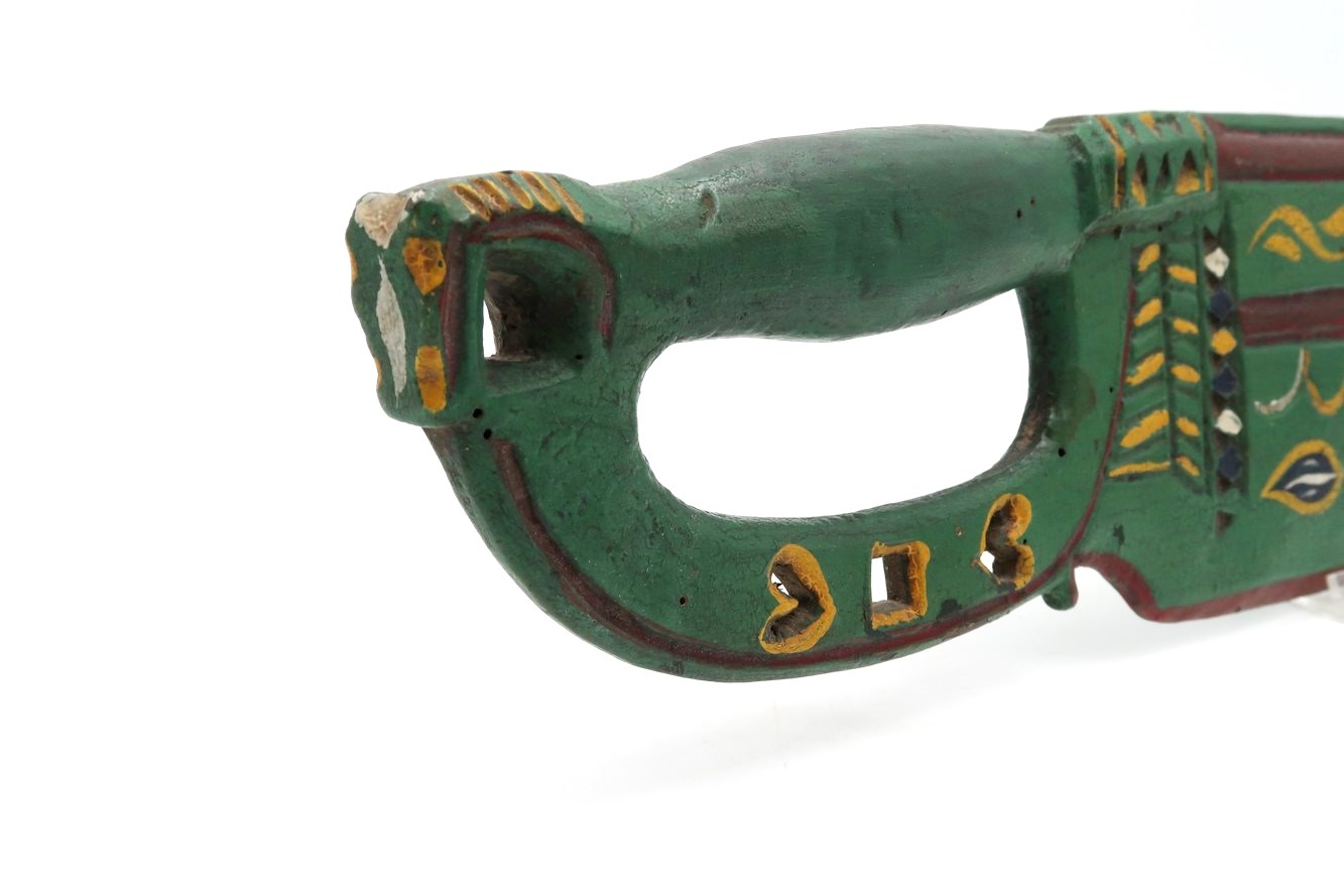 12. Norway, 1858, 81 x 12 cm. Very fine board with an extraordinary handle representing a large lion with its mouth open, sharp teeth, tongue extended, and elongated, menacing eyes. It wears a crown atop its head — that of the Norwegian heraldic coat of arms. The board has beautiful complementary colours, with a stylised floral motif topped by a crown. It is something of a miracle that neither the crown nor the teeth have been broken. $2,000